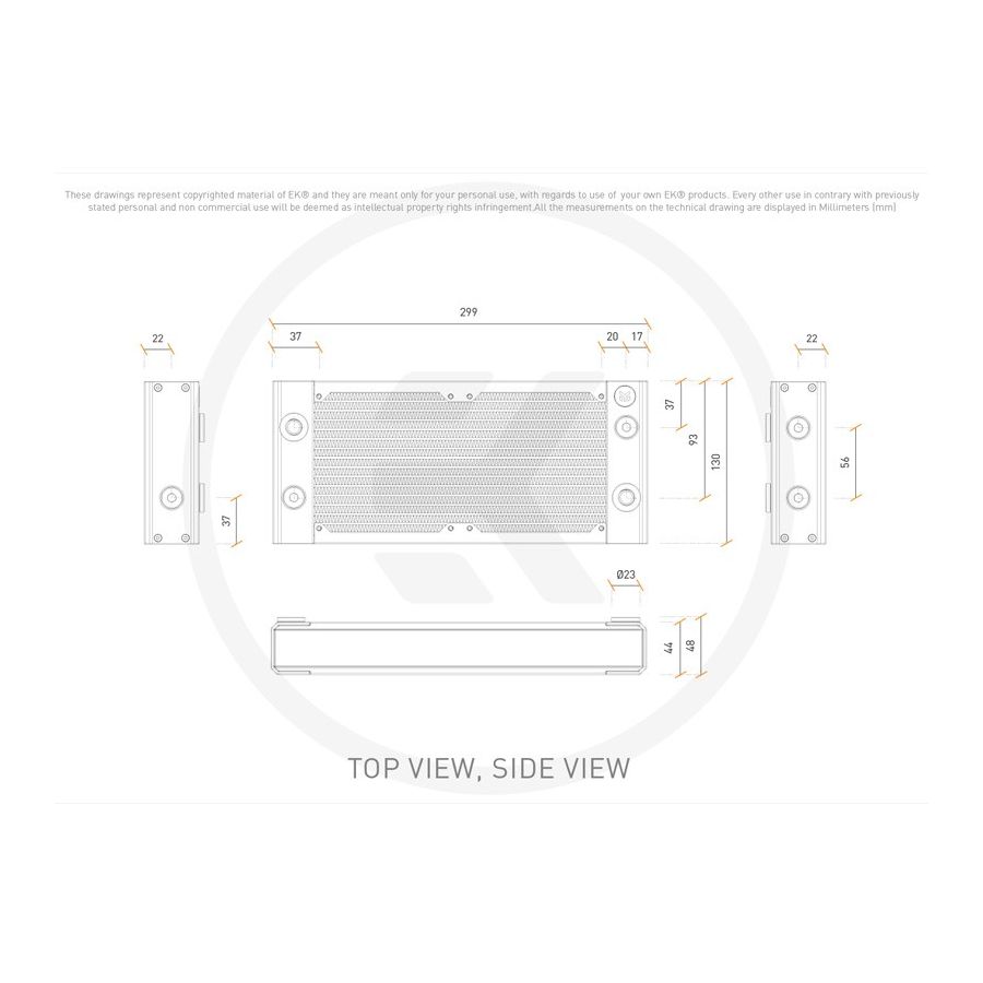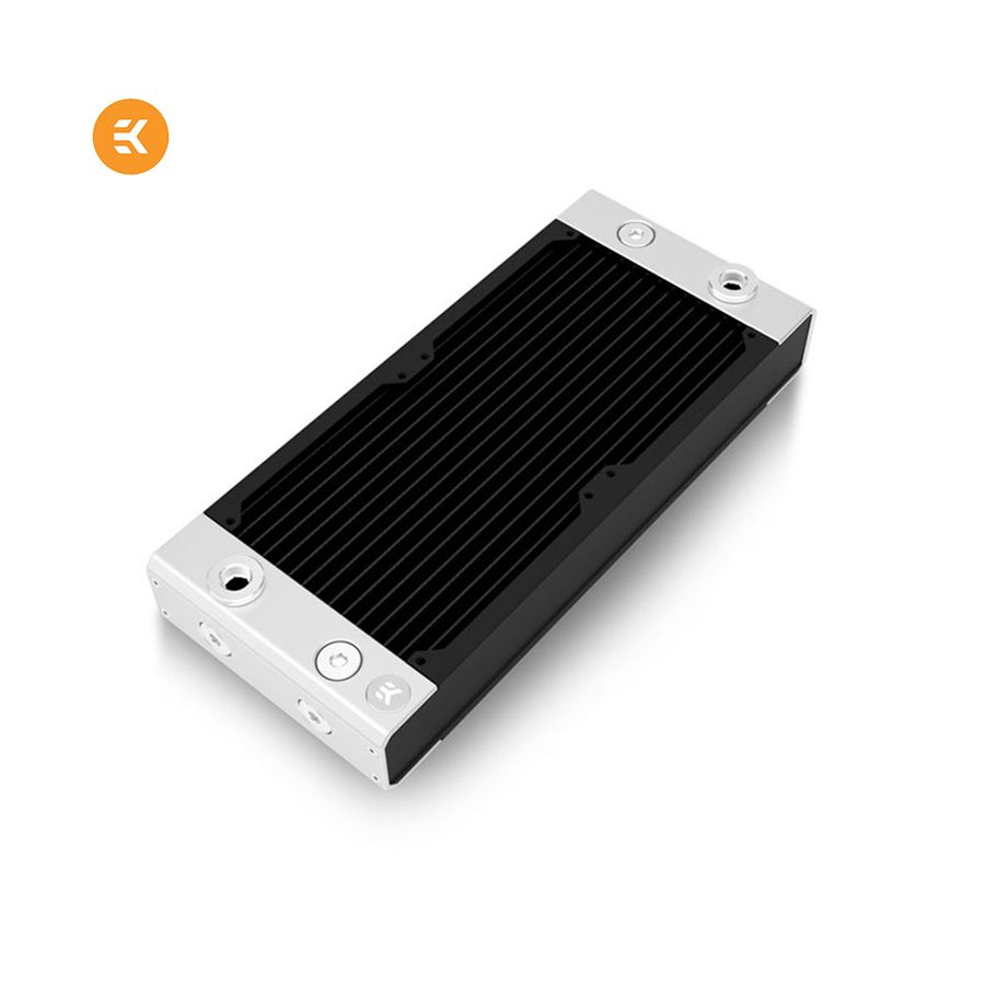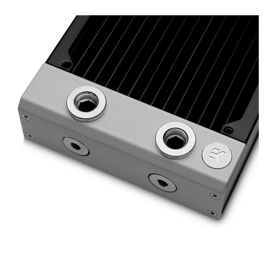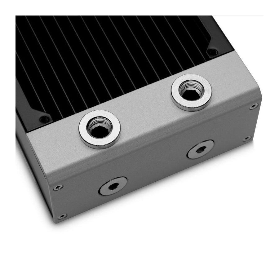 Avec les vis fournies, ce radiateur est compatible avec les ventilateurs de 120 mm qui ont une épaisseur standard de 25 mm. EK recommande d'utiliser des ventilateurs EK ou des ventilateurs similaires avec des cadres à bords scellés. Cette forme carrée classique mais efficace du carter du ventilateur offre des performances optimales en régime de traction (aspiration) ou de poussée (pression) sans aucune perte hydraulique, assurant ainsi la capacité de refroidissement optimale de vos radiateurs à refroidissement liquide.